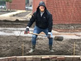 De eerste paal van de Vlindertuin! Twee (van de vele) vrijwilligers van de aanleg van de Vlindertuin hier even in het zonnetje. En op een enorme sokkel, ha. Maar ze deden dan ook 30 van deze palen in 1 dag!